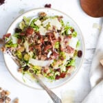 In this hearty winter salad, thinly sliced raw Brussels sprouts provide a delicate and crunchy base with just the right amount of bitterness. Just like roasted or sautéed Brussels sprouts go well with bacon or pancetta, raw Brussels are no different. So this shaved Brussels sprouts salad is topped with crispy bacon bits and a warm maple bacon vinaigrette made with the reserved bacon fat. It's a great salad to offer when you really want to make the extra effort to impress any dinner guests!